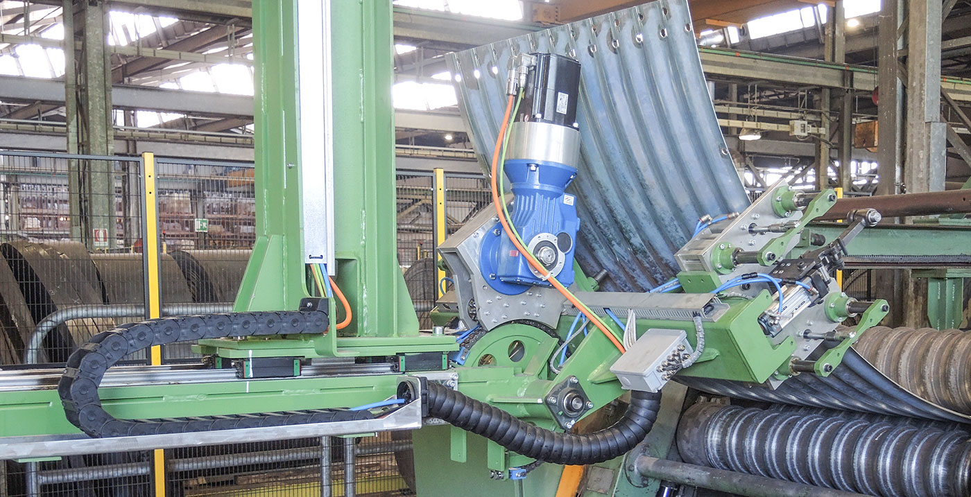 La funzione dell’impianto è il prelievo di lamiere sagomate da una qualsiasi calandra curvatrice e l’impilamento delle stesse su un nastro di evacuazione.